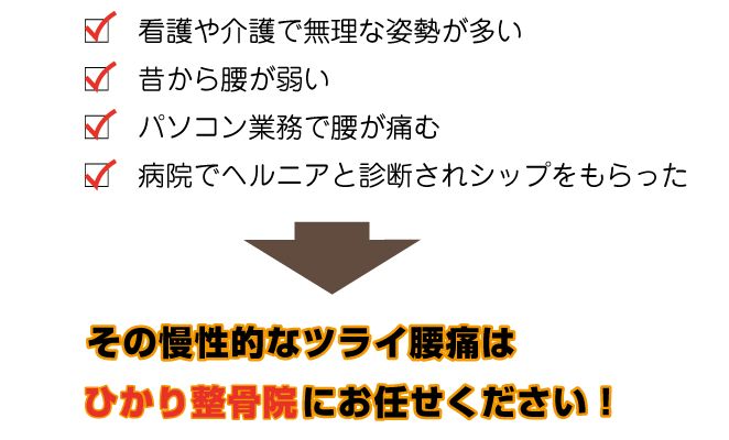 大阪府高槻市真上町のひかり整骨院ではその根本的な原因@=痛いところだけでなく腰痛に関連する筋肉の血行促進と原因A=背骨と骨盤のズレも治療し、すべての根本を取り除き「腰痛」という症状を改善させます。